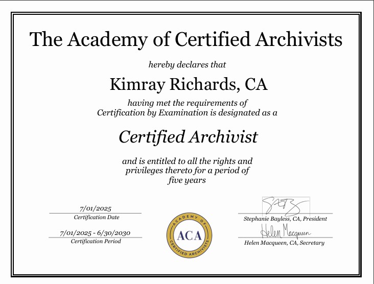 Kimray Richards is an archivist, records manager, and information governance professional who partners with nonprofits and foundations, government agencies, libraries, archives, cultural institutions, small law firms, professional practices, universities, research centers, and faith‑based organizations to appraise, arrange, describe, and preserve records in both physical and digital formats.